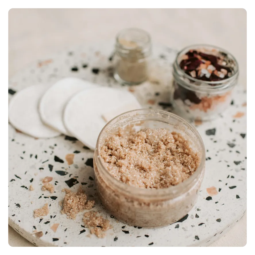 Descarga gratis 2 recetas fáciles con ingredientes que ya tienes: exfoliante facial y exfoliante corporal.